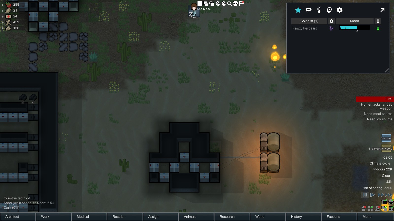 Colonists can build structures of a various materials each with different beauty flammability and hit points.